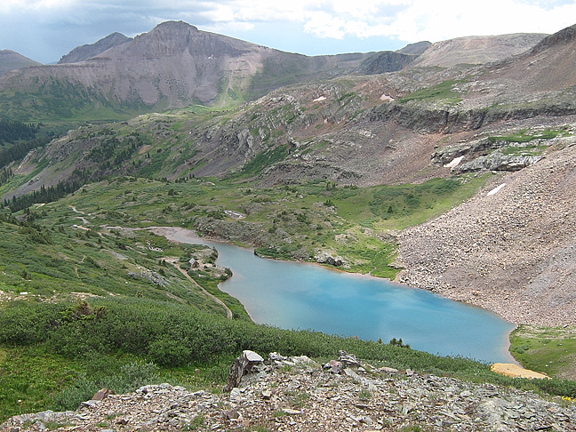 Looking east: the narrow trail (left), the Beartown road, and Kite Lake. Photo courtesy of Tim Briese