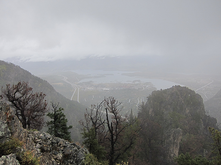 Looking down at Frisco and the Dillon Reservoir through heavily overcast skies.